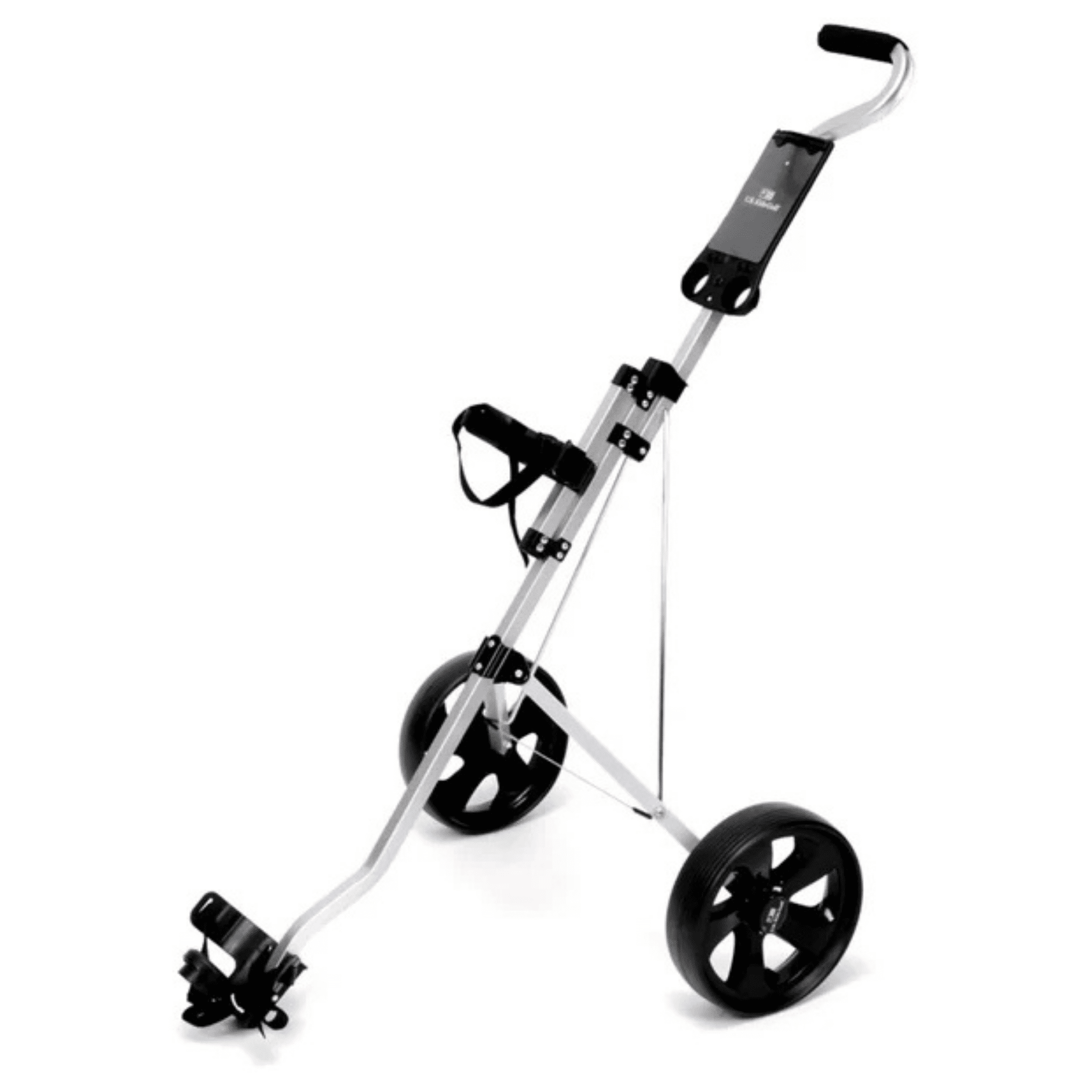 Lightweight construction pull cart with detachable wheels. Adjustable top bracket to fit golf bags 23" (UL45) and above. The dual strap secures the golf bag to the cart.