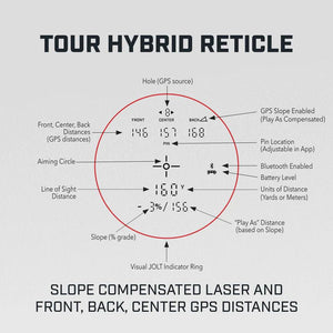Experience Slope distances like never before with the Tour Hybrid. Our first device to feature Slope compensated laser distances AND Slope compensated GPS distances. Confidently make club selections with both lasered distances to the pin as well as GPS-powered front/center/back yardages right in the display.