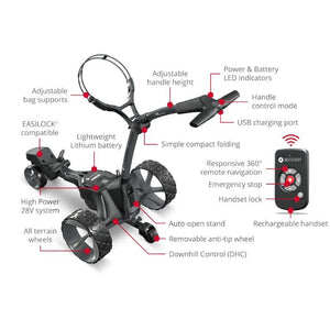 Seamlessly switch between remote and handle control modes, while built-in convenience features—including a remote handset lock, pause and resume, plus emergency stop—ensure smooth operation on the course. Stay powered up with the integrated USB charging port, perfect for keeping your devices charged while you play. And, when the fun has finished, the compact folding design makes for easy storage and transport.