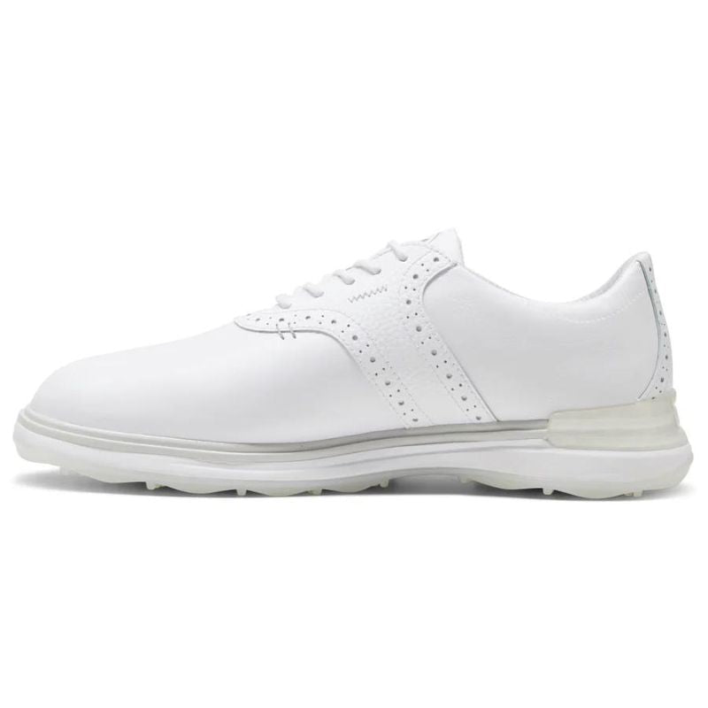 Featuring a waterproof, premium full-grain leather upper with broguing details, the PUMA AVANT Golf Shoes deliver a classic look and timeless style. The shoe's Profit insole and Profoam midsole combine to provide exceptional comfort and energy return as you traverse the course while a TPU heel counter and welt stabilize the foot during the golf swing. On the sole, over one hundred and ten strategically placed traction elements keep you firmly planted and swinging with confidence.